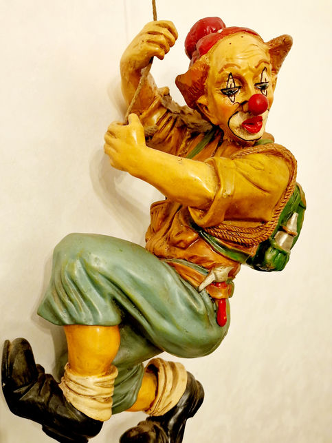 Clown en porcelaine vintage grimpant à une corde, dans le style de Jun Asilo