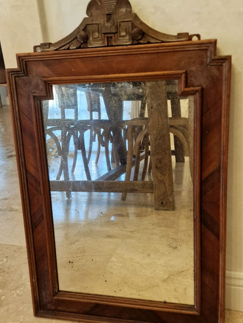 Veneer has minor separation and surface wear, but structural integrity is intact. Mirror shows age-related foxing and spotting