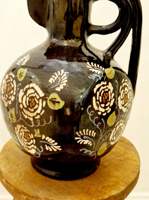 Set of 2 vintage Eastern European (likely Romanian or Hungarian) folk hand-painted ceramic vases, shaped like decanters. Black with colorful painted flowers and handles. Exceptional aesthetic, very decorative. Eastern European folk pottery Probably mid-to-late 20th century